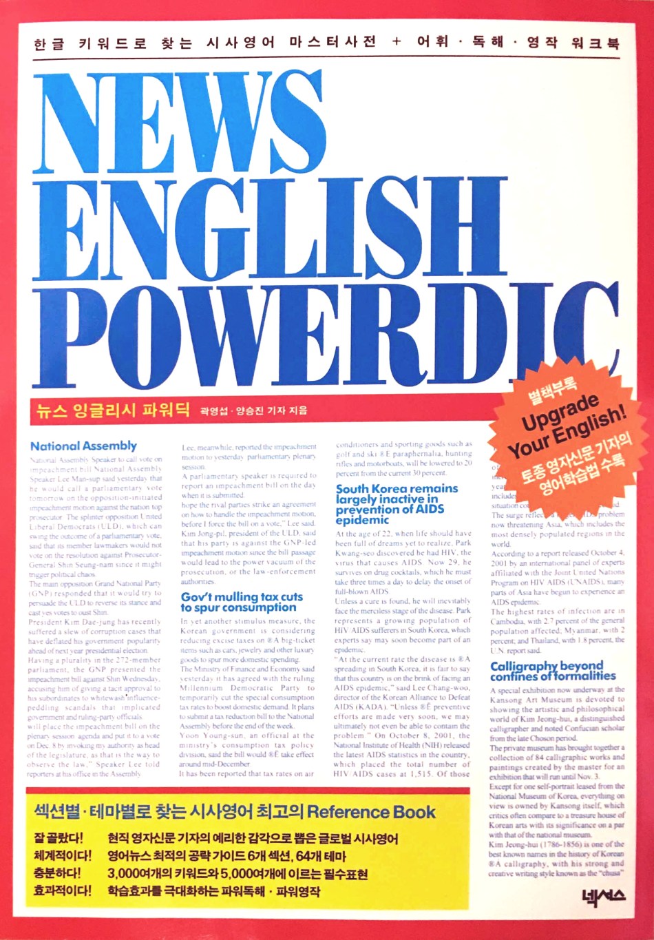 지난 2002년 일년간 곽영섭 선배와 같이 공동작업을 통해 기획하여 2003년 초에 출판된 시사영어참고서입니다. 출판사는 영어학습서 시장에서 두각을 나타내고 있는 “넥서스”이며 동시통역대학원 준비생, 재학생과 고급 시사영어를 익히려는 대학생, 직장인을 대상으로 만들었습니다.